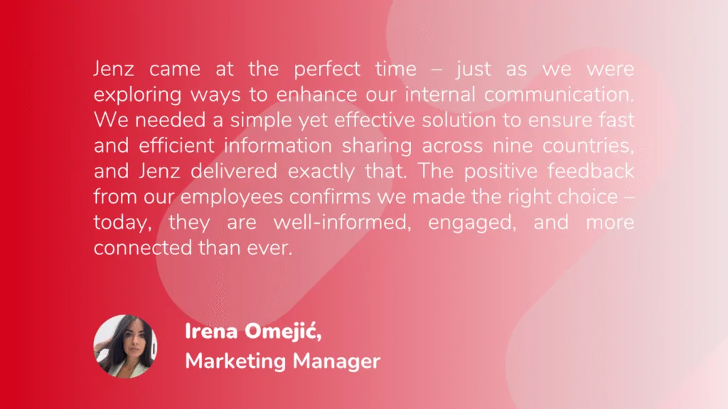 Jenz came at the perfect time – just as we were exploring ways to enhance our internal communication. We needed a simple yet effective solution to ensure fast and efficient information sharing across nine countries, and Jenz delivered exactly that. The positive feedback from our employees confirms we made the right choice – today, they are well-informed, engaged, and more connected than ever.