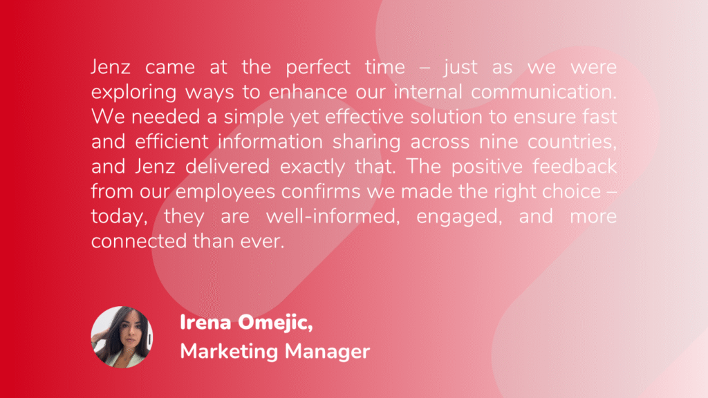 Jenz came at the perfect time – just as we were exploring ways to enhance our internal communication. We needed a simple yet effective solution to ensure fast and efficient information sharing across nine countries, and Jenz delivered exactly that. The positive feedback from our employees confirms we made the right choice – today, they are well-informed, engaged, and more connected than ever.
